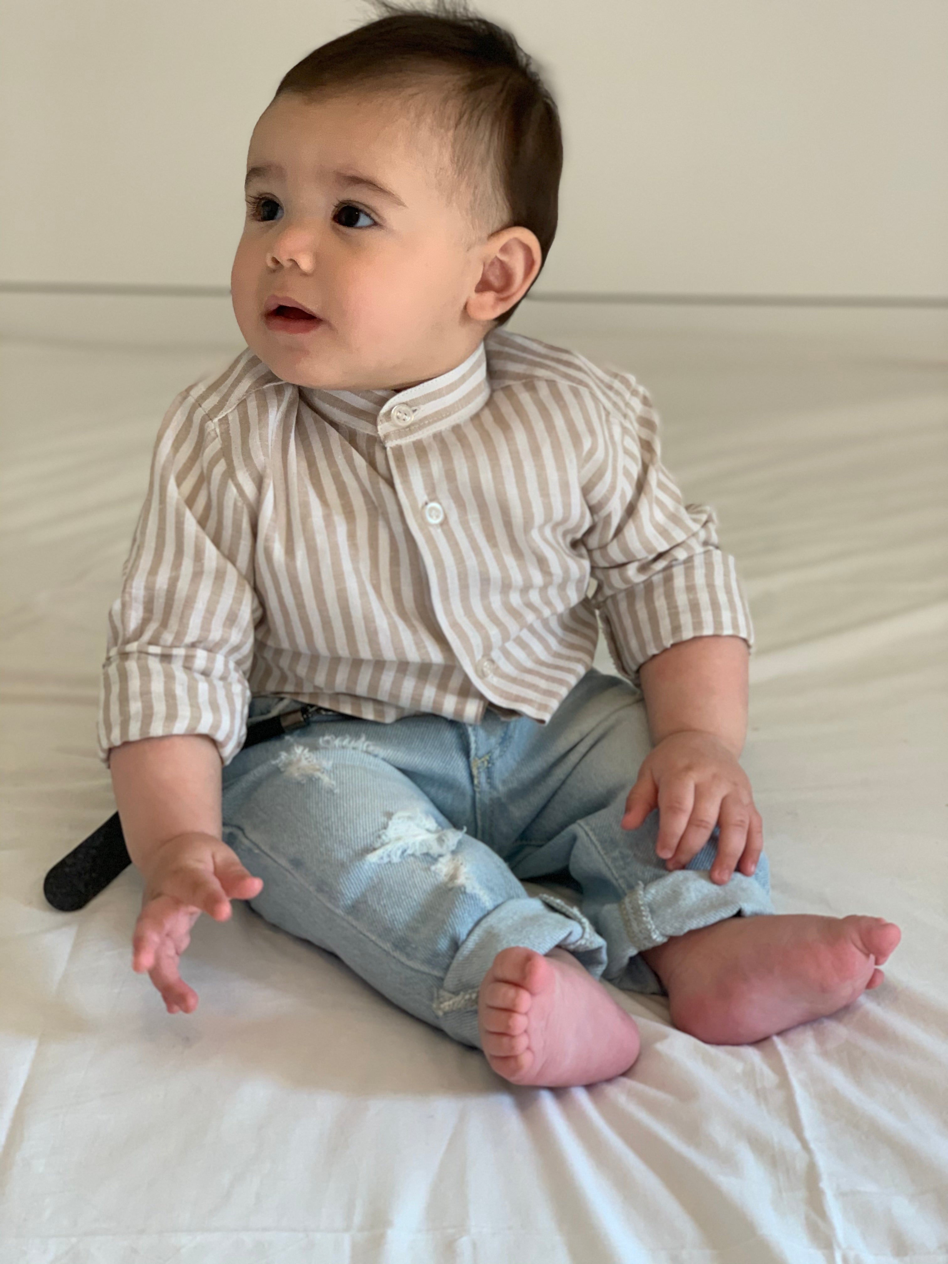 Camicia Lino Neonato Collo Coreano Rigata Beige
