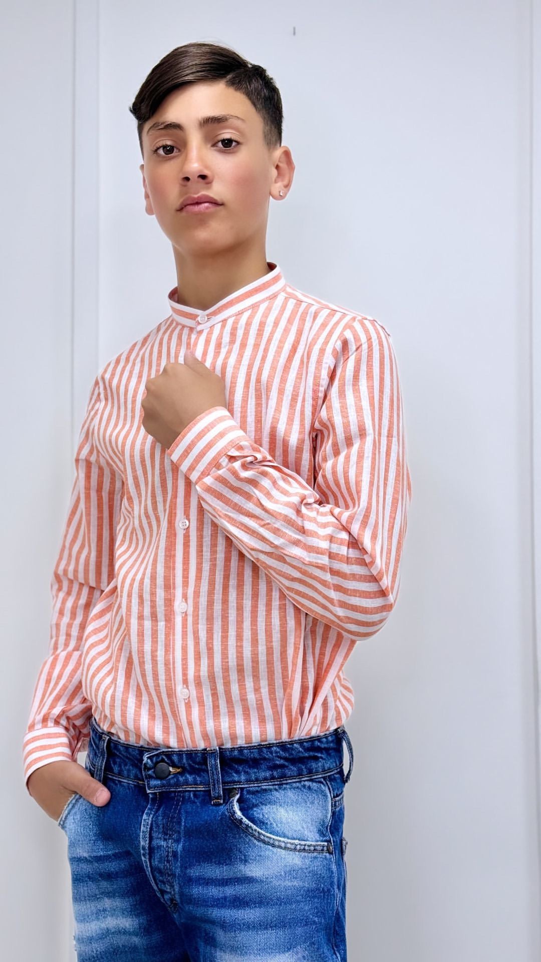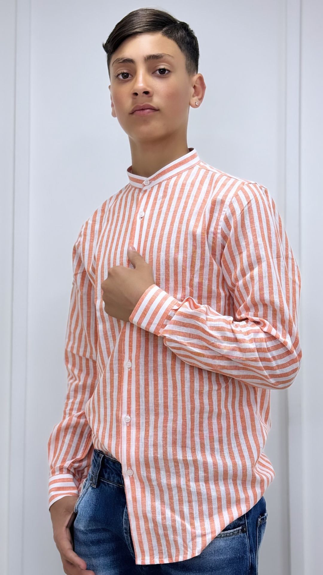 Camicia Bimbo Lino Collo Coreano Rigata Arancione