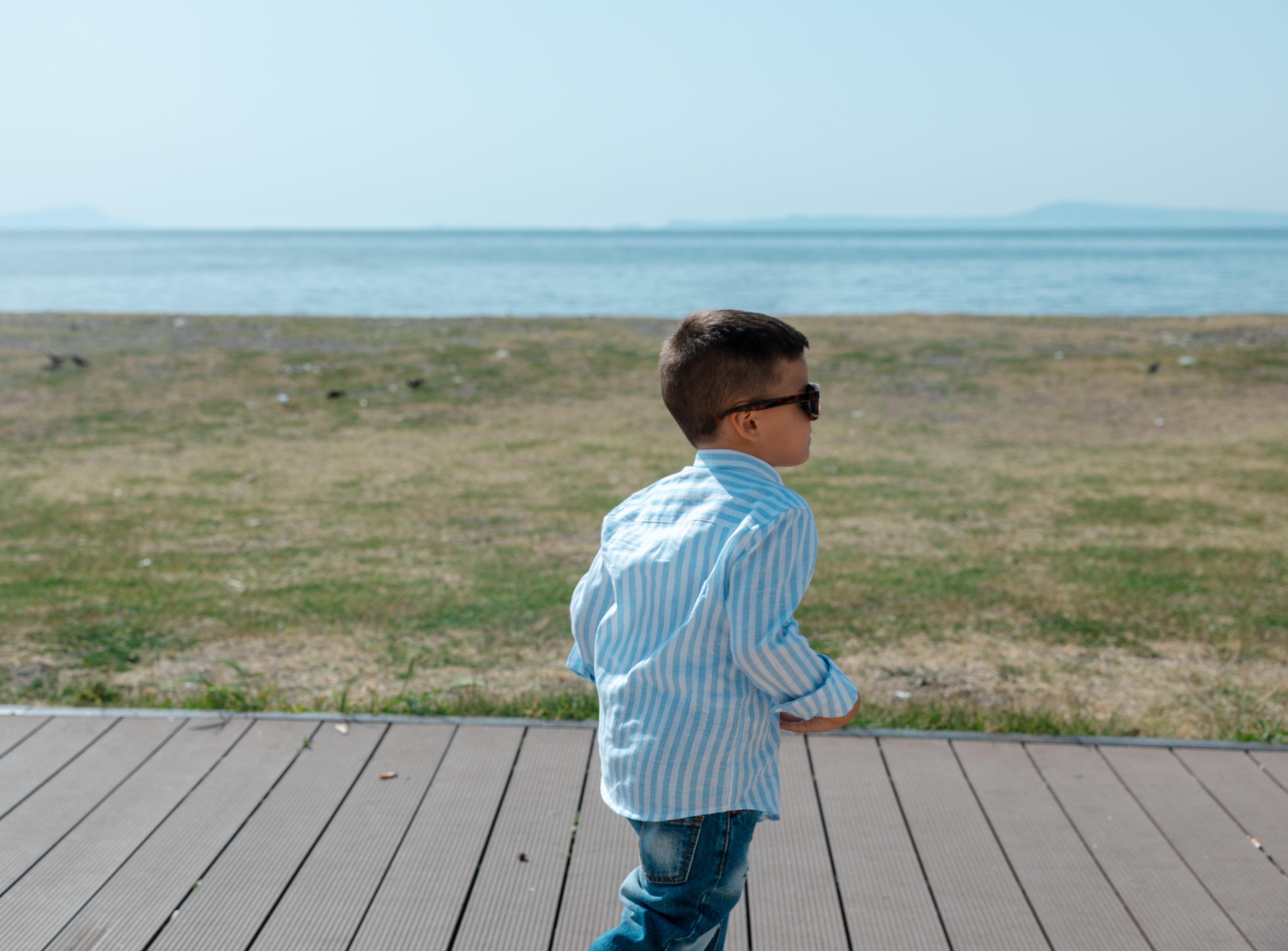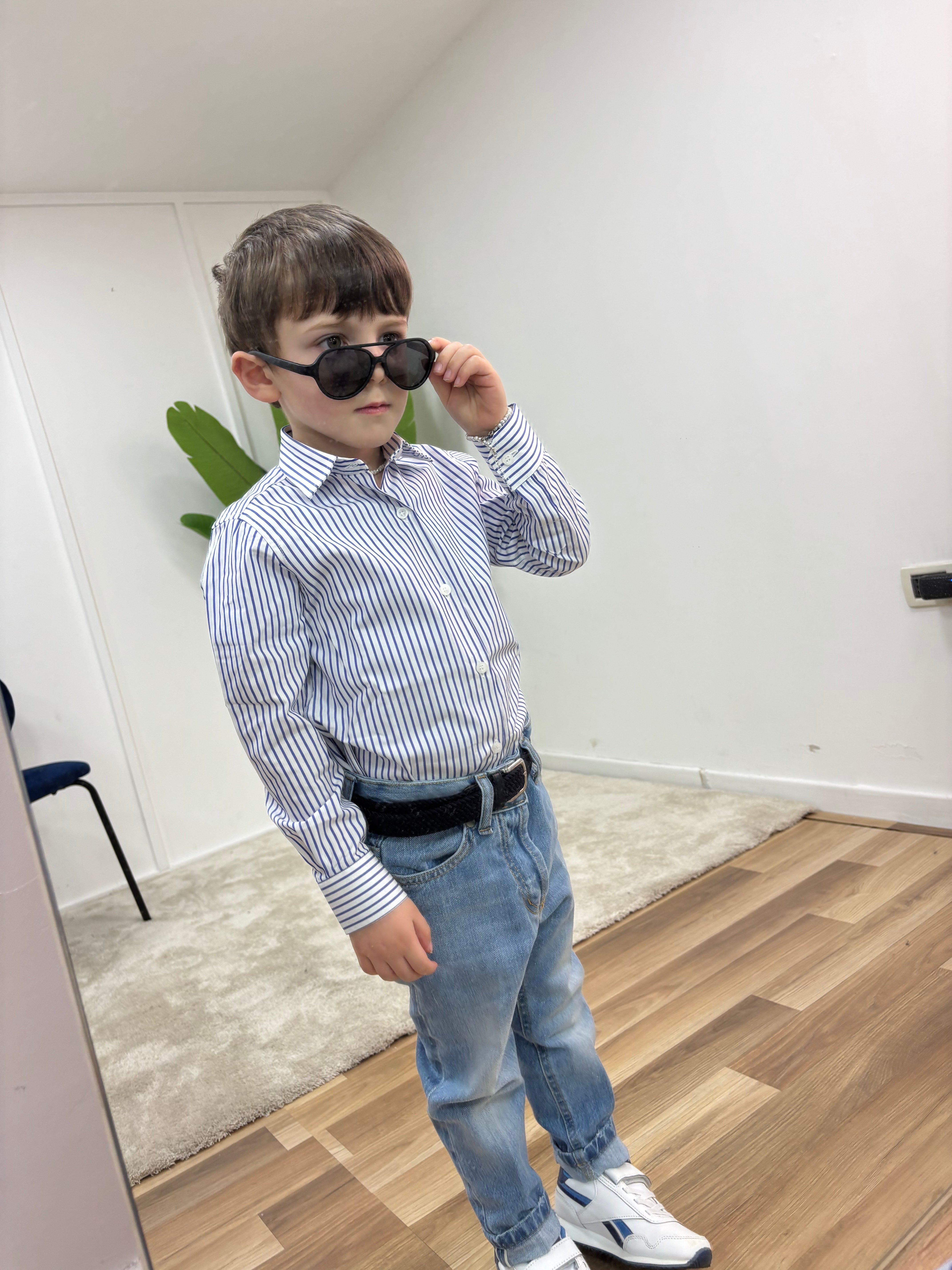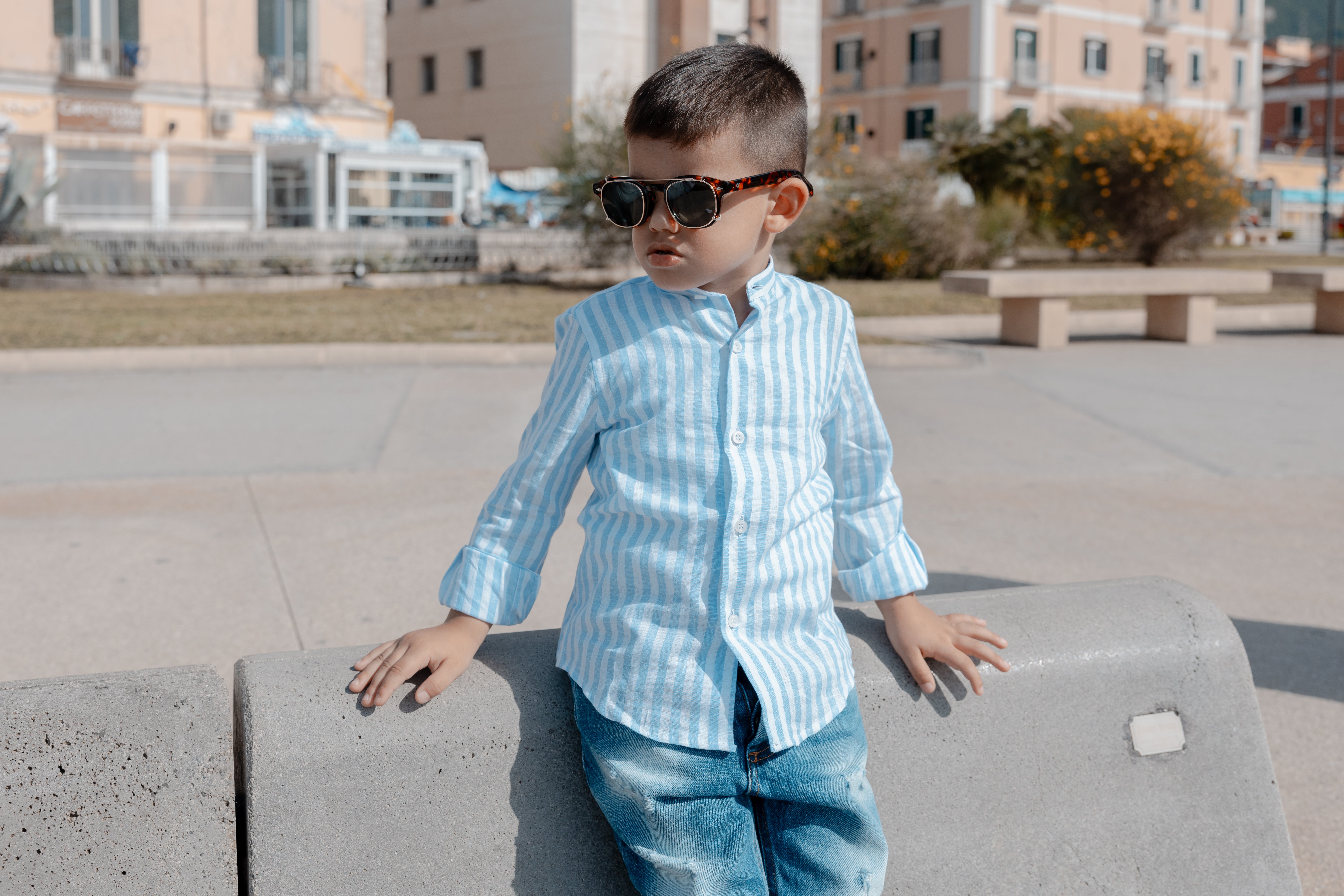 Camicia Bimbo Lino Collo Coreano Rigata Celeste
