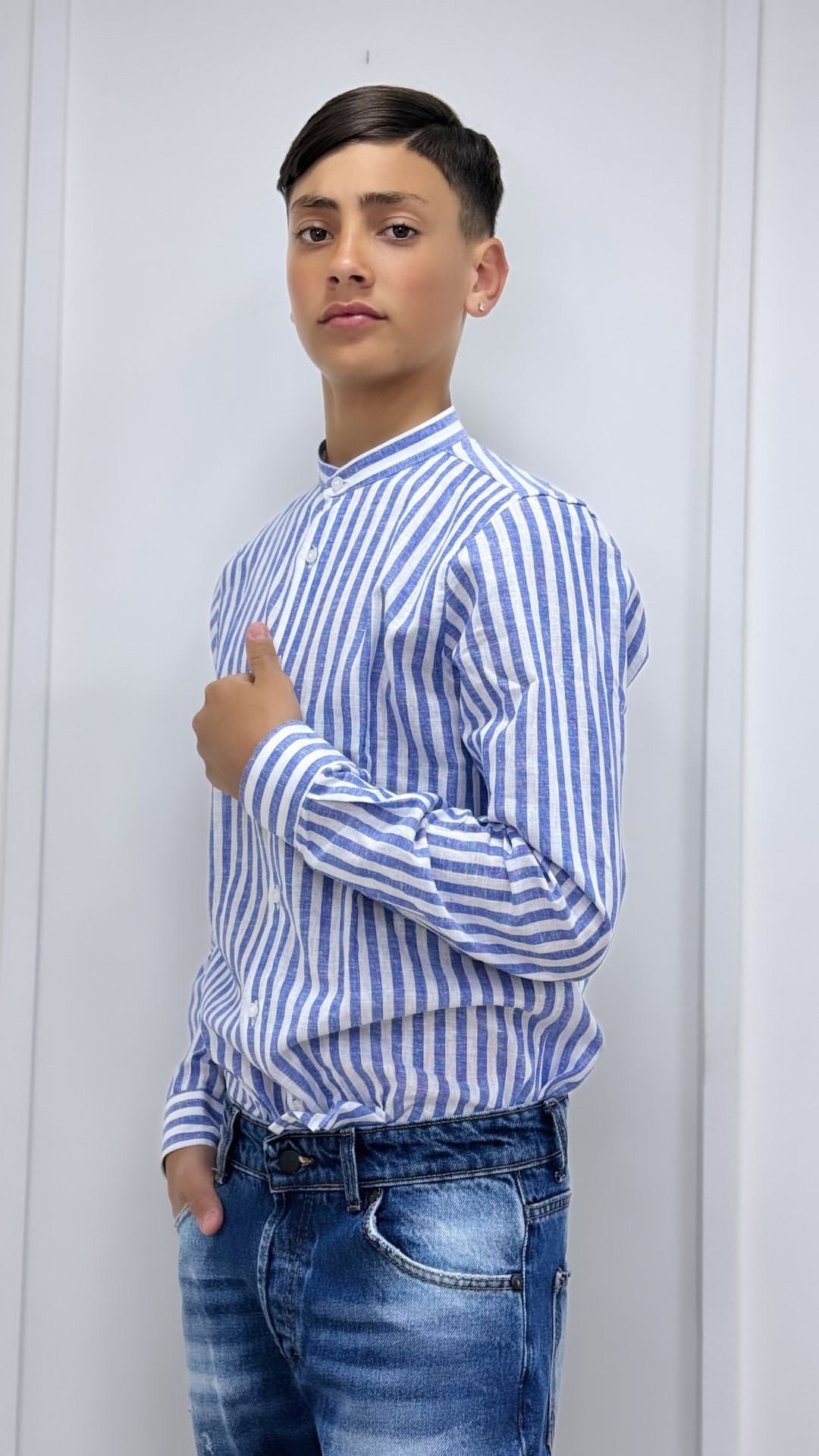 Camicia Bimbo Lino Collo Coreano Rigata Blu