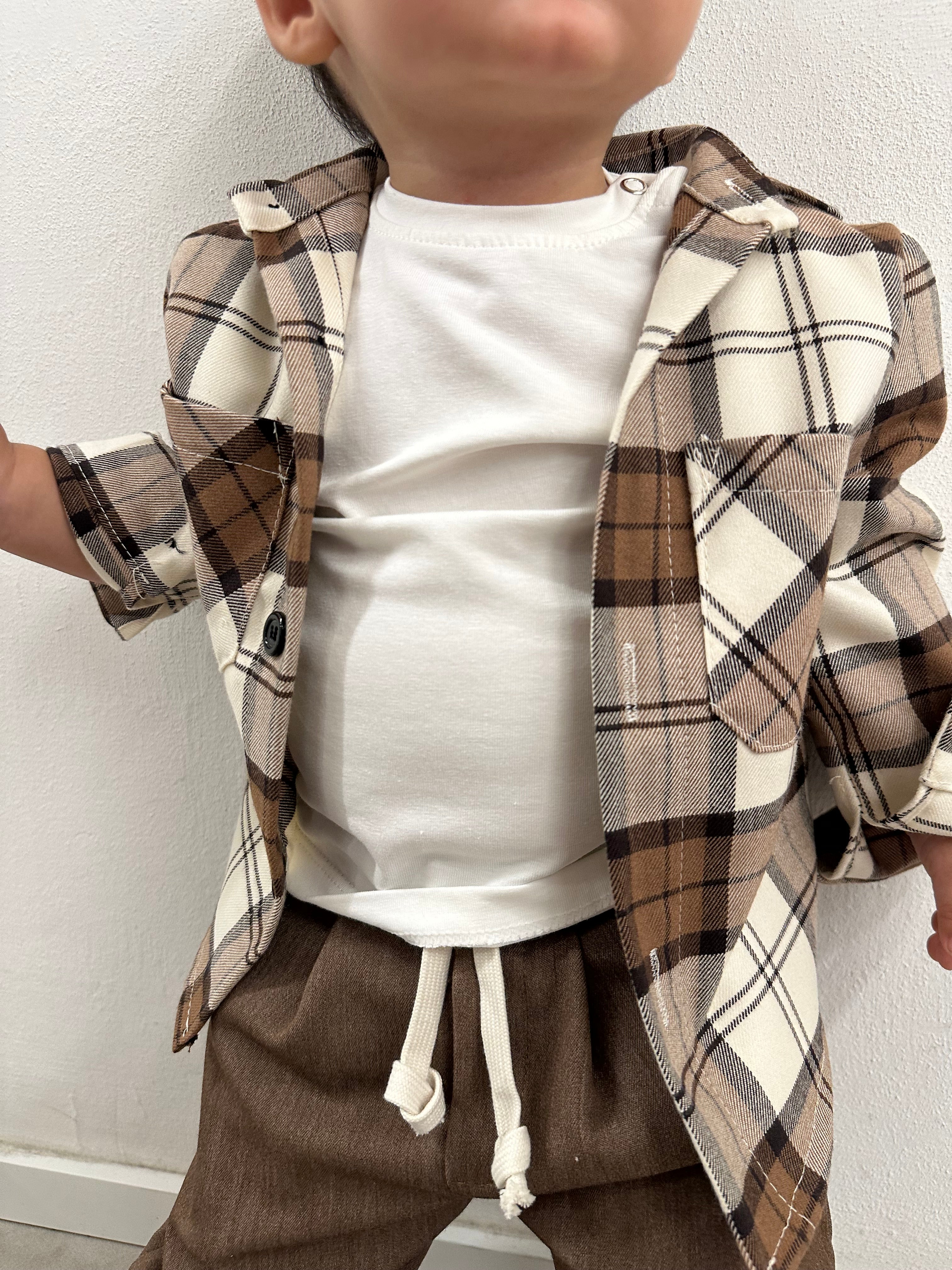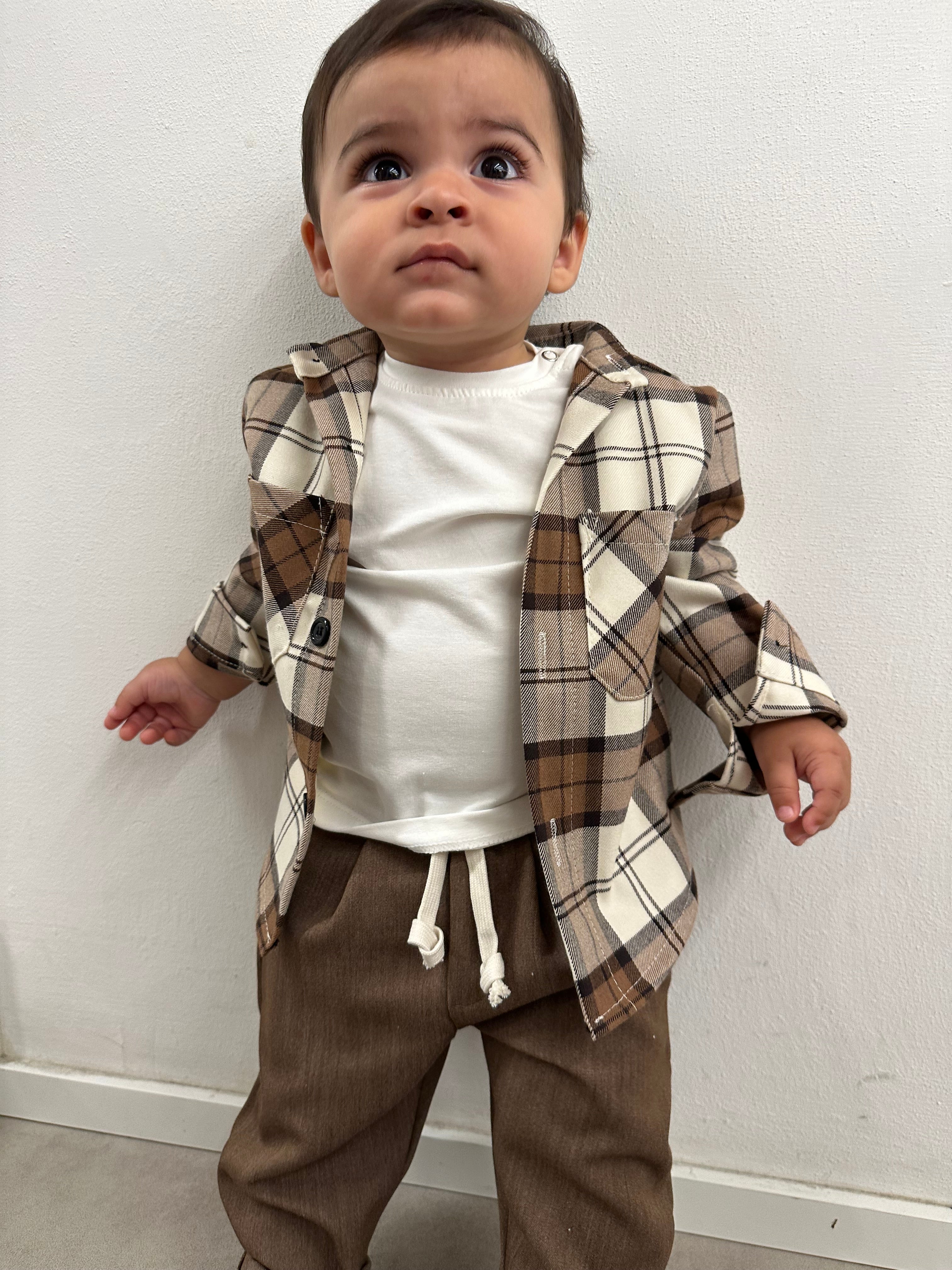 Questa camicia a quadri marrone in poliviscosa è il capo ideale per i bambini vivaci. Dotata di taschini laterali e bottoncini, unisce praticità e allegria. Il set include anche una morbida t-shirt basic mezza manica in cotone, perfetta per ogni avventura di tutti i giorni. Un outfit semplice ma pieno di stile!