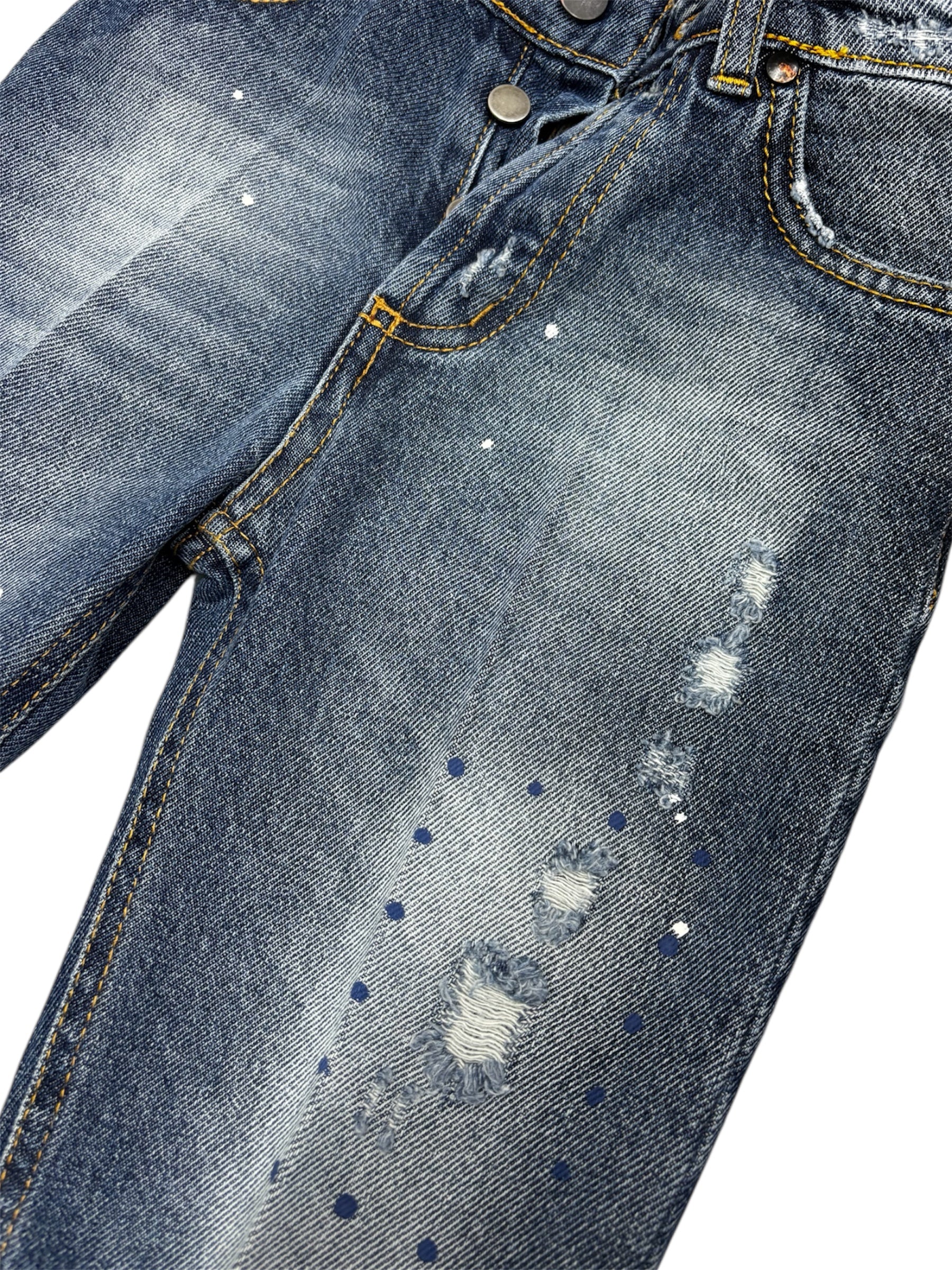 I Jeans Modern Style V101 sono realizzati in un tessuto morbido che coccola la pelle del tuo bambino. Le piccole abrasioni e i dettagli luminosi aggiungono un tocco vivace e divertente, munito di tasche anteriori e posteriori con bottoncini alla chiusura rendono ogni movimento più speciale. Il risvoltino di 3 cm completa il look con un pizzico di allegria, adattandosi perfettamente alla vestibilità comoda e fresca ideale per ogni piccola avventura!